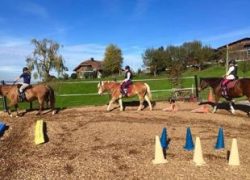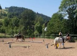Anschliessend geht’s mit dem Steckenpferd in die Reithalle – wir trainieren Dressur, Springen oder machen fantasievolle „Ausritte“, oft in Begleitung unserer echten Ponys.